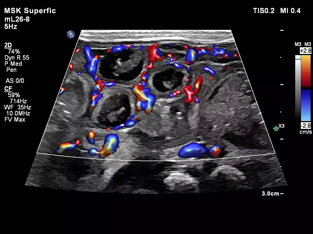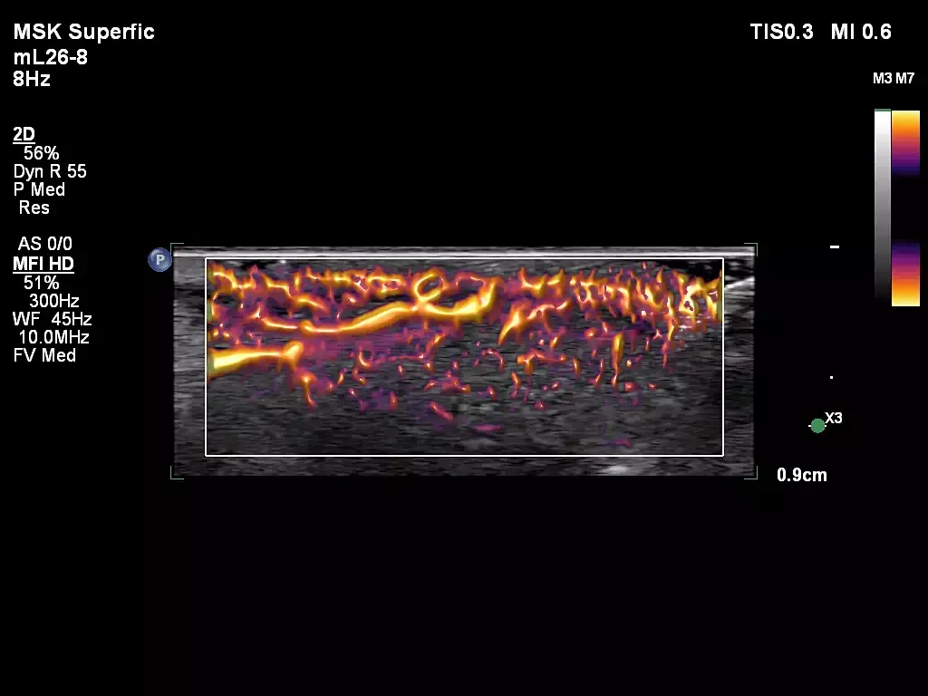 Designed to detect slow and weak blood flow anatomy in tissue. This proprietary approach overcomes many of the barriers associated with conventional methods to detect small vessel blood flow with high resolution and minimal artifacts. MicroFlow Imaging maintains high frame rate and 2D image quality while applying advanced artifact reduction techniques to reveal small vessel anatomy